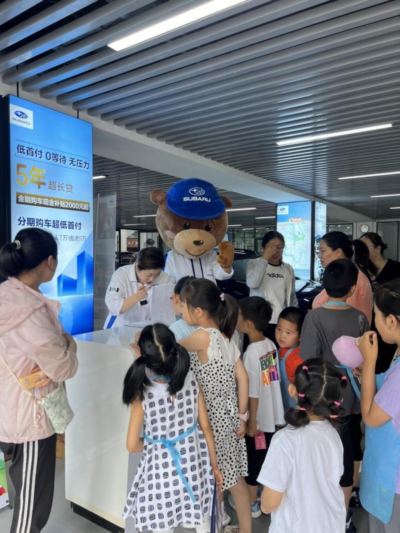 早上伴着夏日暖阳,斯巴鲁小小熊已经在门口等待我们小朋友的到来,孩子们看到小熊都十分开心,活动的愉快氛围全开。小熊和每位参加活动的小朋友热情挥手,小朋友也不吝啬自己的笑容。