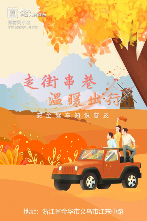 2023年11月17日中国人保举办“走街串巷 温暖出行”活动,青岩刘小区站,将为各位车主普及安全驾车知识,欢迎您到活动现场了解!
