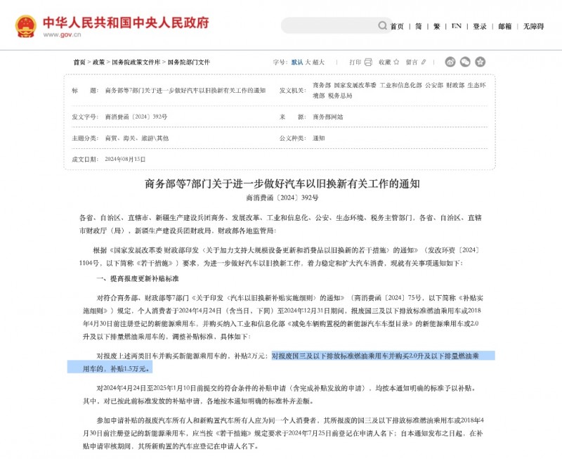 国家提高报废补贴标准,对符合《汽车以旧换新补贴实施细则》规定,报废旧车并购买2.0升及以下排量燃油乘用车的补贴从7000元提高至1.5万元!