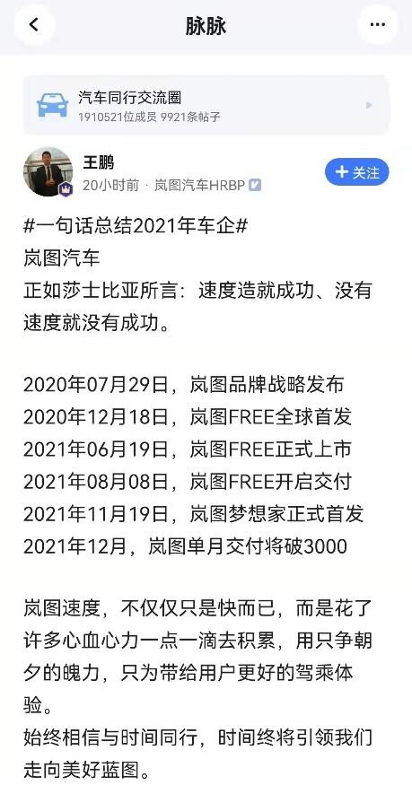 认证为岚图汽车员工的脉友则引用莎士比亚的名言“速度造就成功、没有速度就没有成功”来为岚图的2021做总结。而岚图今年的表现也足以印证这句话:6月,岚图FREE正式上市;8月,岚图FREE开启交付;11月,岚图梦想家正式首发。
